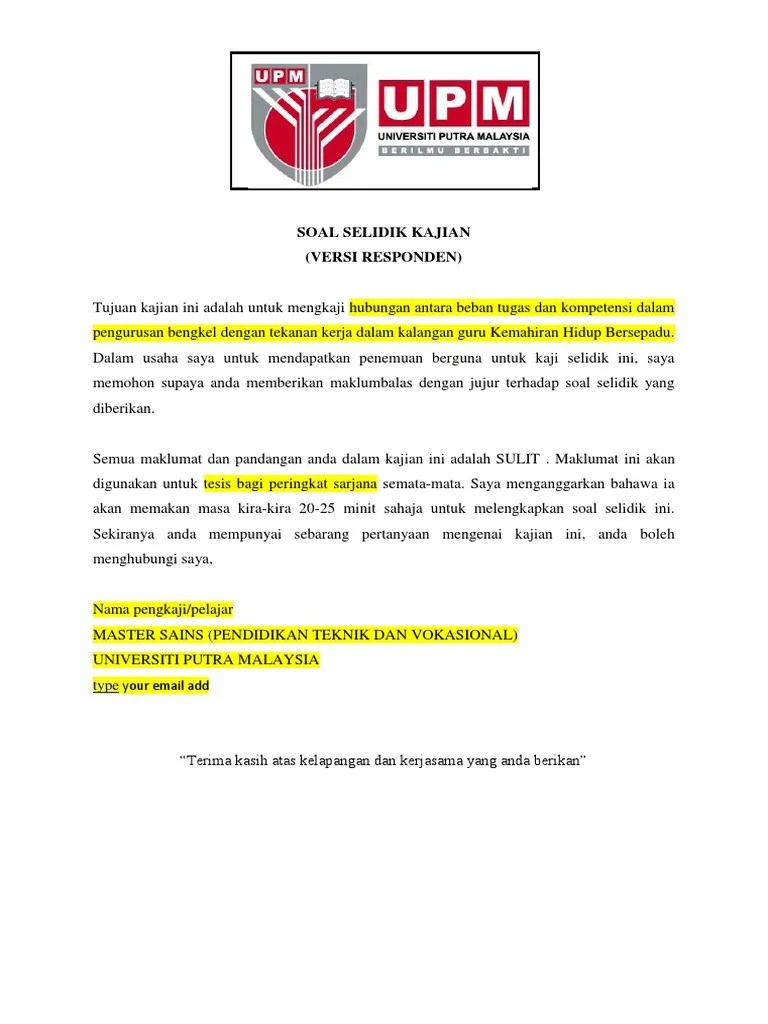 Berikut merupakan contoh borang soal selidik yang saya sediakan dengan menggunakan perisian survey monkey. Pada tahun 2017, borang kaji selidik telah diedarkan kepada 94 . Oleh itu analisis data bagi borang soal selidik ini akan bermula dari 1 danberakhir dengan 5.3.8kesimpulankaedah kajian ini bertujuan memudahkan penyelidik . Analisis soal selidik ini adalah analisis yang memerlukan responden untuk menjawab semua soalan yang diberikan kepada mereka.